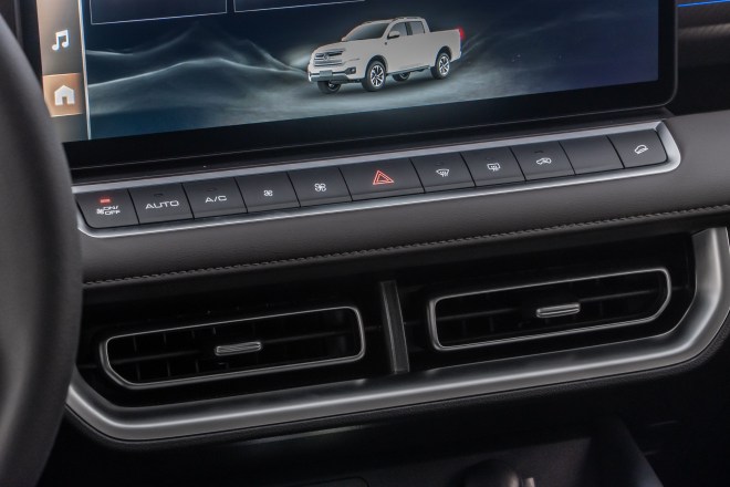 A cabine da versão Exclusive, segundo a GWM, oferece acabamento em couro legítimo, painel soft touch, paddle shift no volante para troca das marchas e resfriamento/aquecimento de bancos.