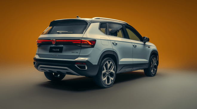 Para 2026, a assinatura de design é o destaque. Encontrar o novo Taos nas ruas será tarefa fácil: ele é primeiro modelo da VW, no mercado nacional, a receber o logo iluminado na traseira.